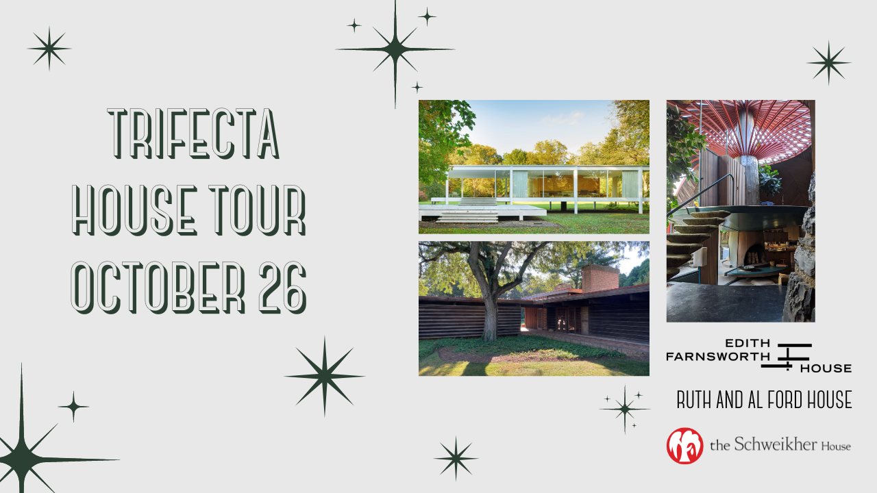 Join us for an unforgettable day exploring three masterworks of Modernist architecture: the Schweikher House, the Edith Farnsworth House, and the rarely accessible Sam & Ruth Van Sickle Ford House—a privately owned residence not open to the general public. This is a truly unique opportunity to step inside a hidden architectural gem.