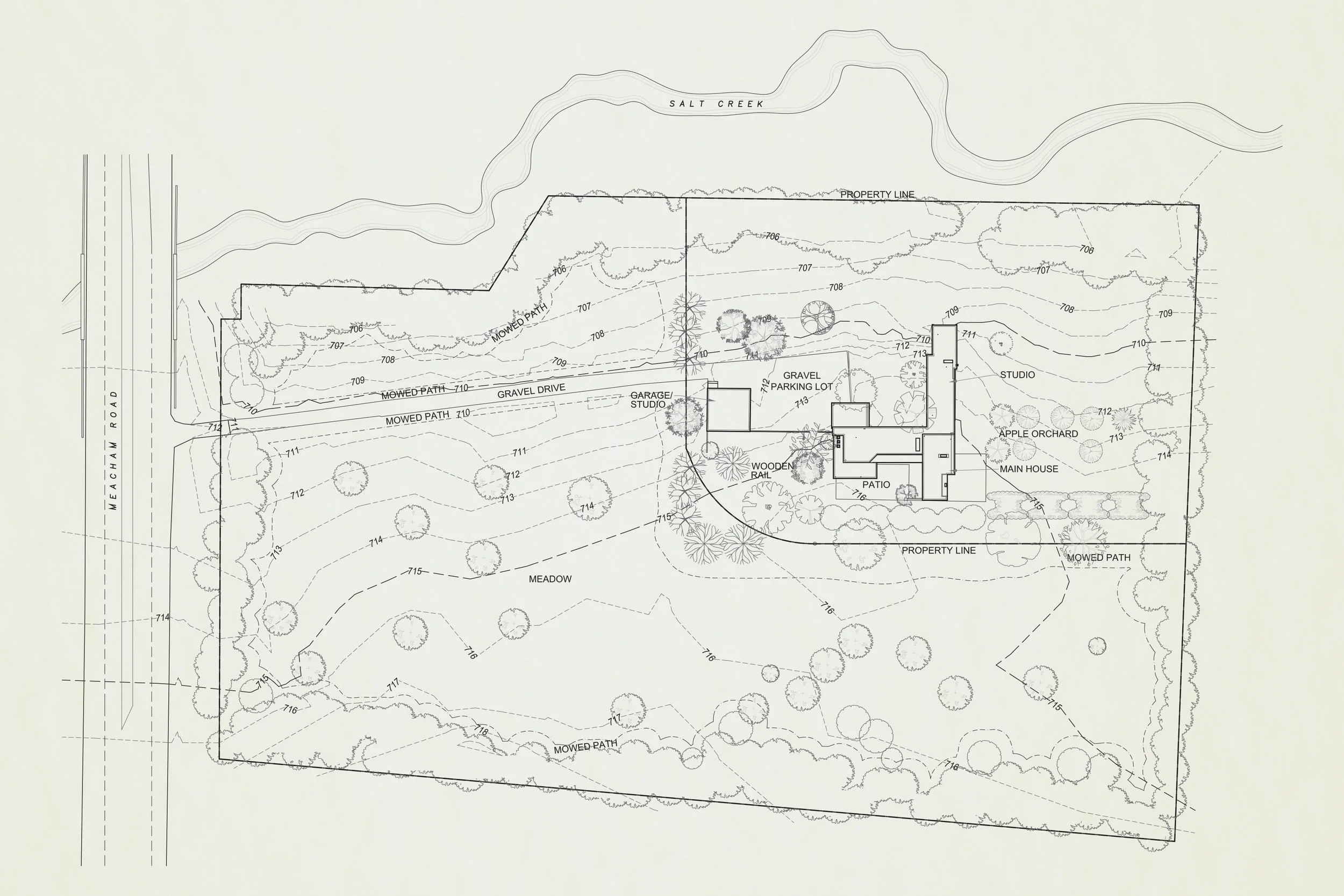 The actual site for the house was on the edge of a farm in what was then the town of Roselle (later to become part of Schaumburg). The land was acquired prior to the trip as a gift, in addition to his architect fee, for his work in transforming a large barn on the nearby Kern farmstead into a residence for L.D. Kern in the mid-1930’s. Schweikher was intrigued by the potential of rural living on a site endowed with a generous horizon and gentle creek yet close enough to commuter rail service to bustling Chicago.